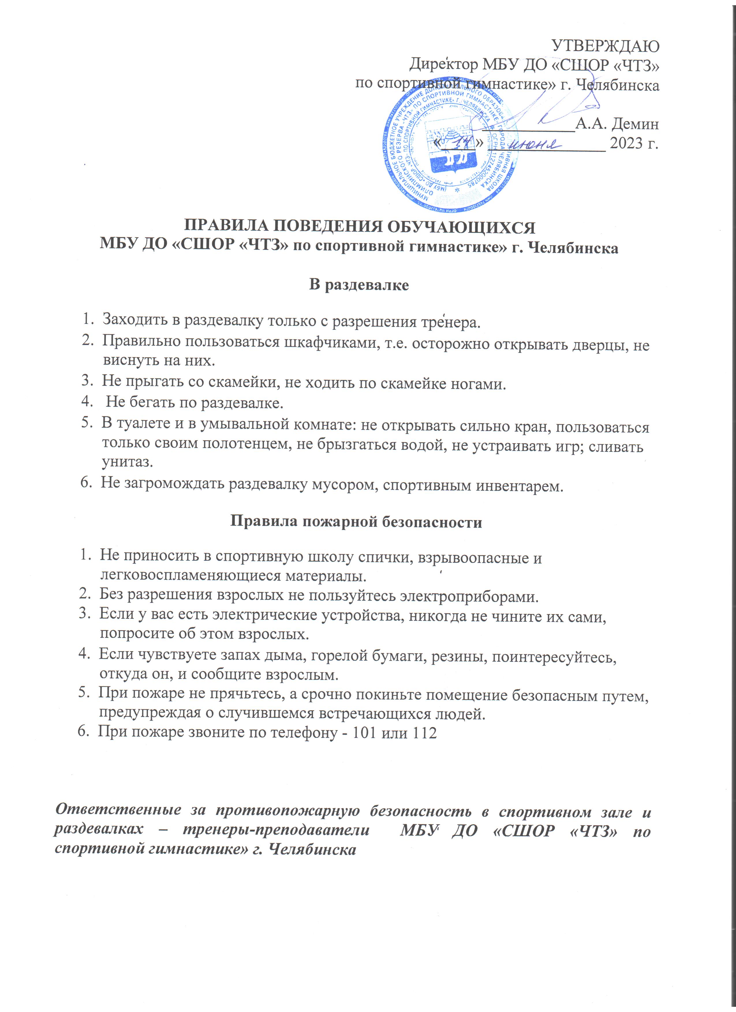 Инструкция о мерах пожарной безопасности для сотрудников МБУ ДО "СШОР "ЧТЗ" по спортивной гимнастике" г. Челябинска